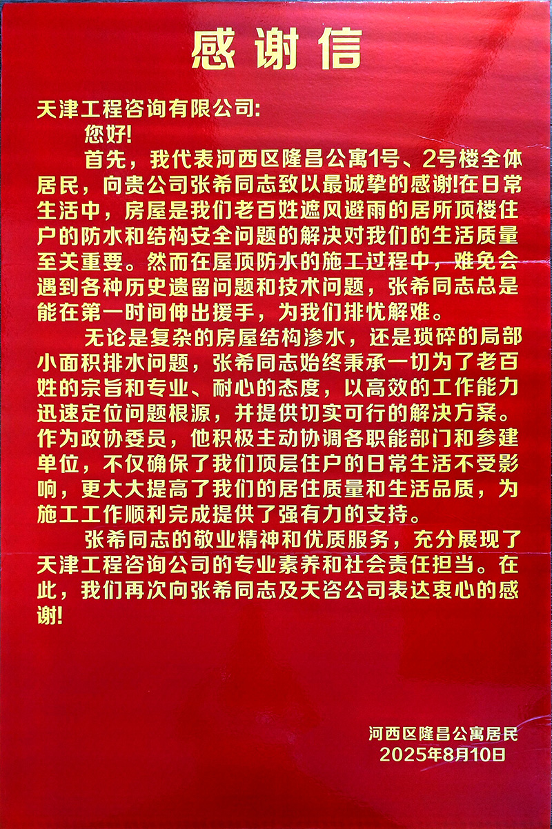 為有效促進工程進展,項目團隊主動加強與居民、街道和社區(qū)的多層次溝通。在各小區(qū)設立聯(lián)絡點,及時公開施工與監(jiān)理信息,迅速響應居民關切。如隆昌公寓屋面滲水問題,團隊僅用三天便協(xié)調解決,展現(xiàn)出高效務實的作風。施工前主動告知計劃,協(xié)助居民做好防護,合理安排作業(yè)時間避開休息時段,還為年長體弱居民提供搬運幫助。這些細致入微的服務贏得了居民的廣泛贊譽,特地送來感謝信,表揚團隊“專業(yè)、耐心、高效”。